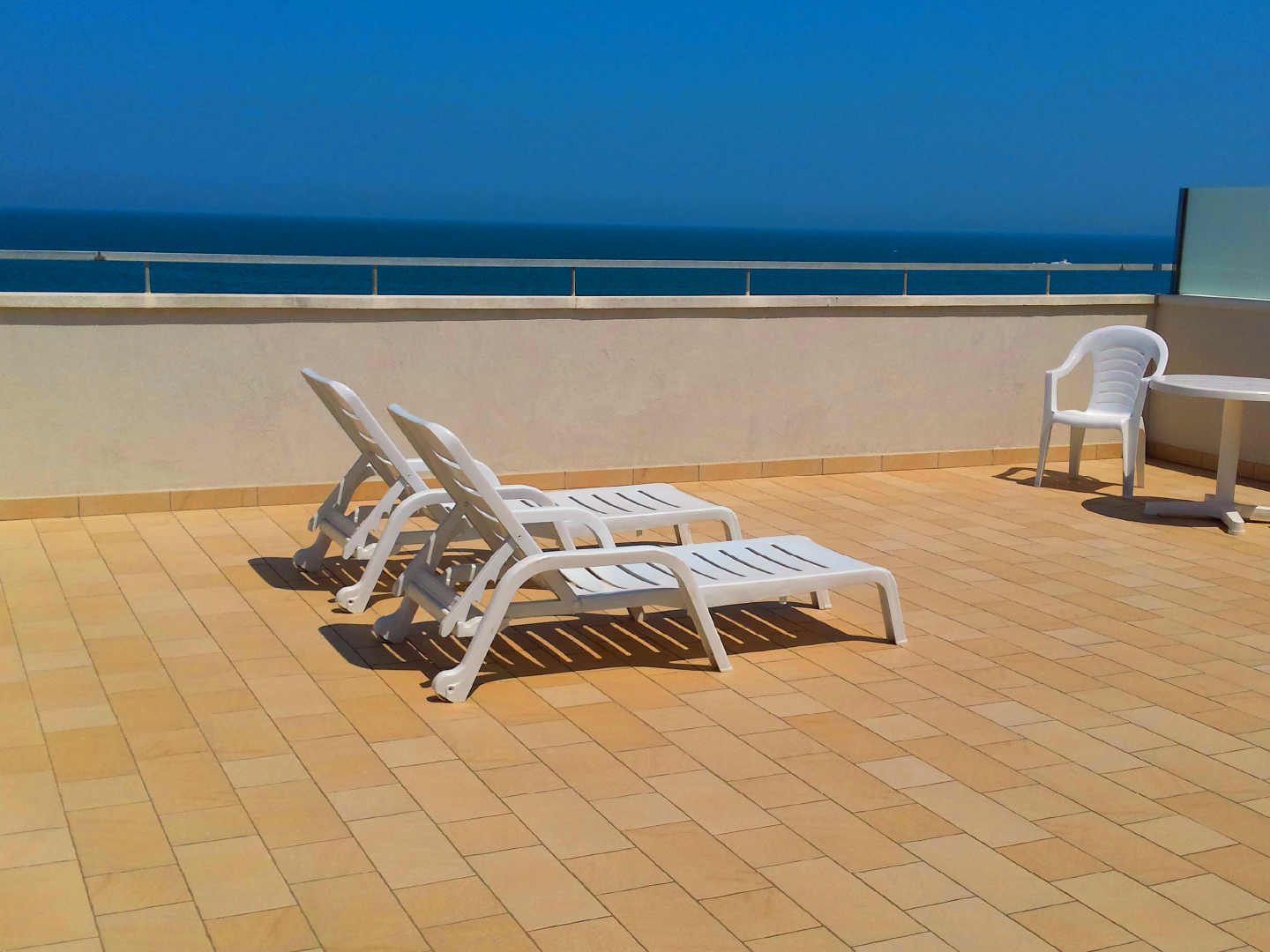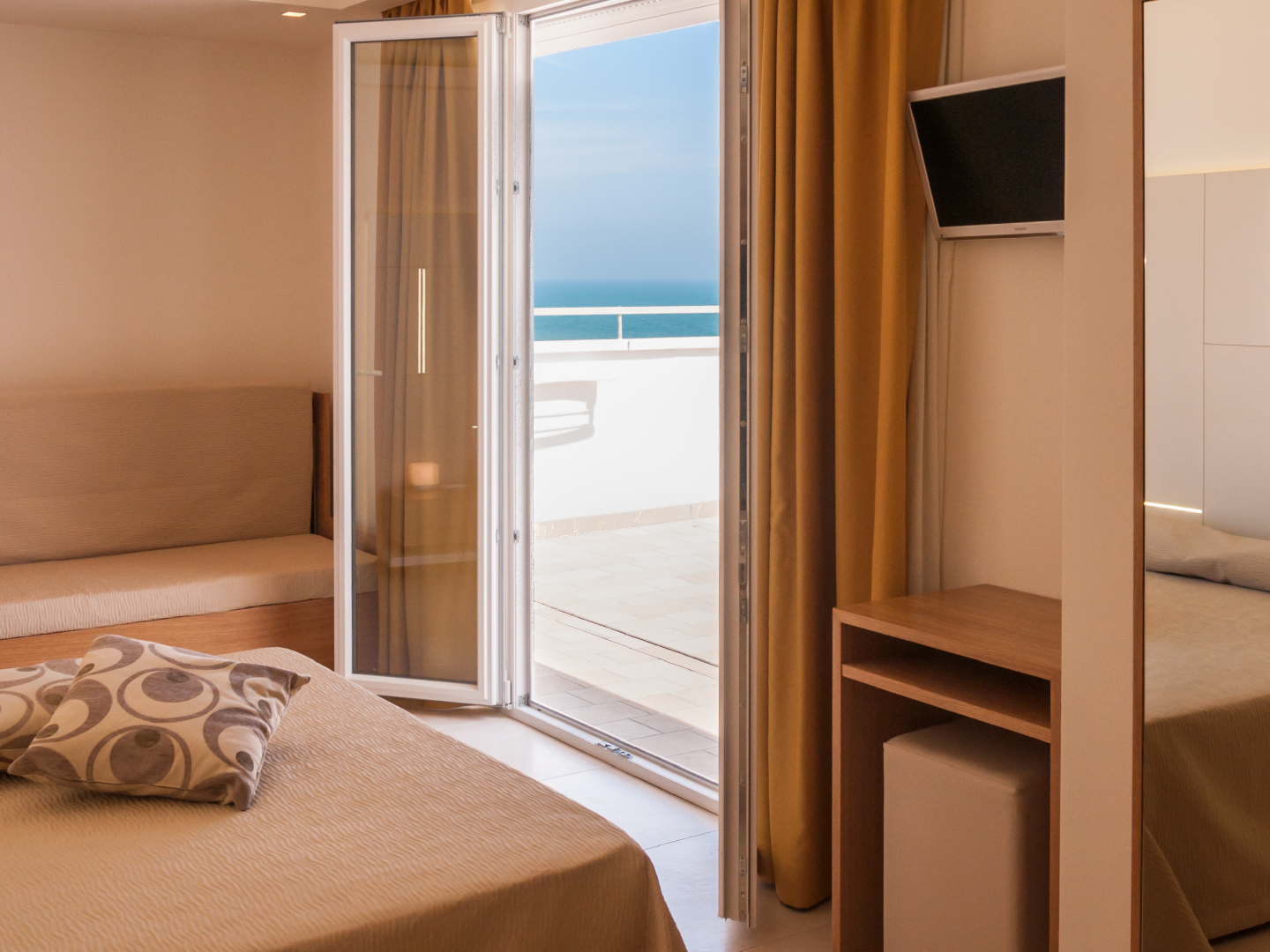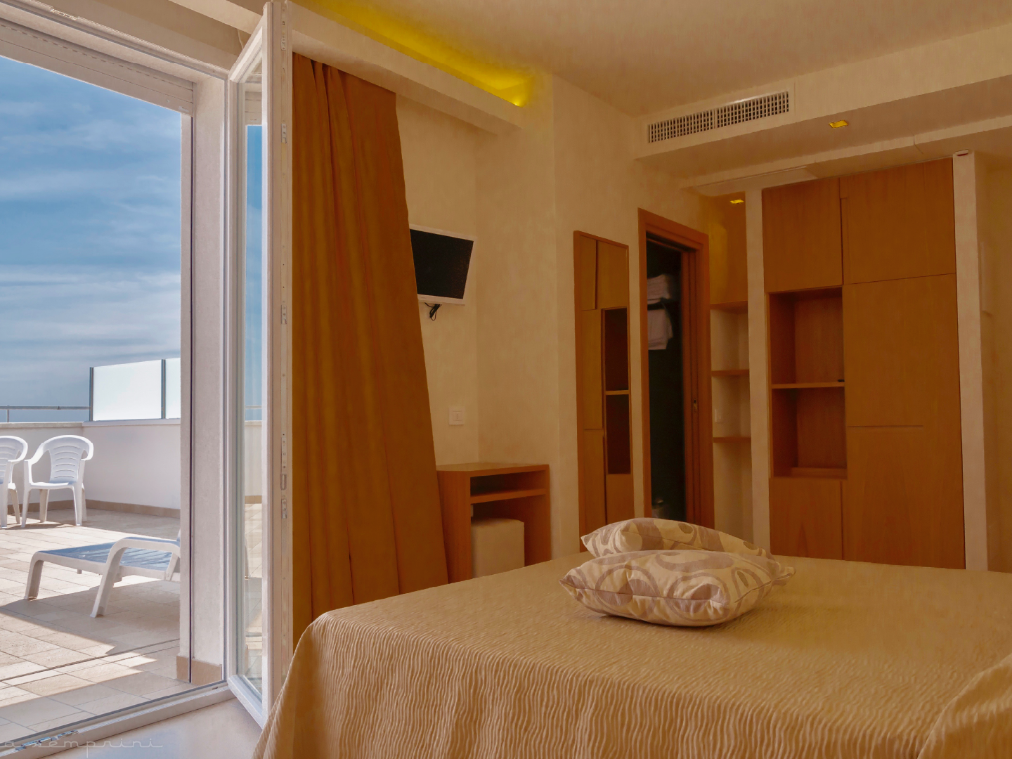 Discover the Junior Suite, an exclusive penthouse with a panoramic balcony overlooking the sea and a large sunbathing area.